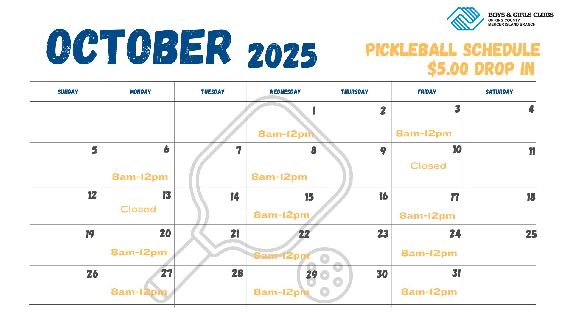 - Regular MWF drop-in pickleball has resumed at the Mercer Island Boys and Girls Club.
